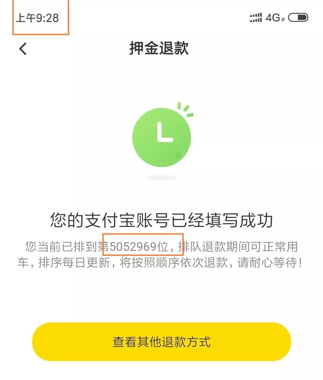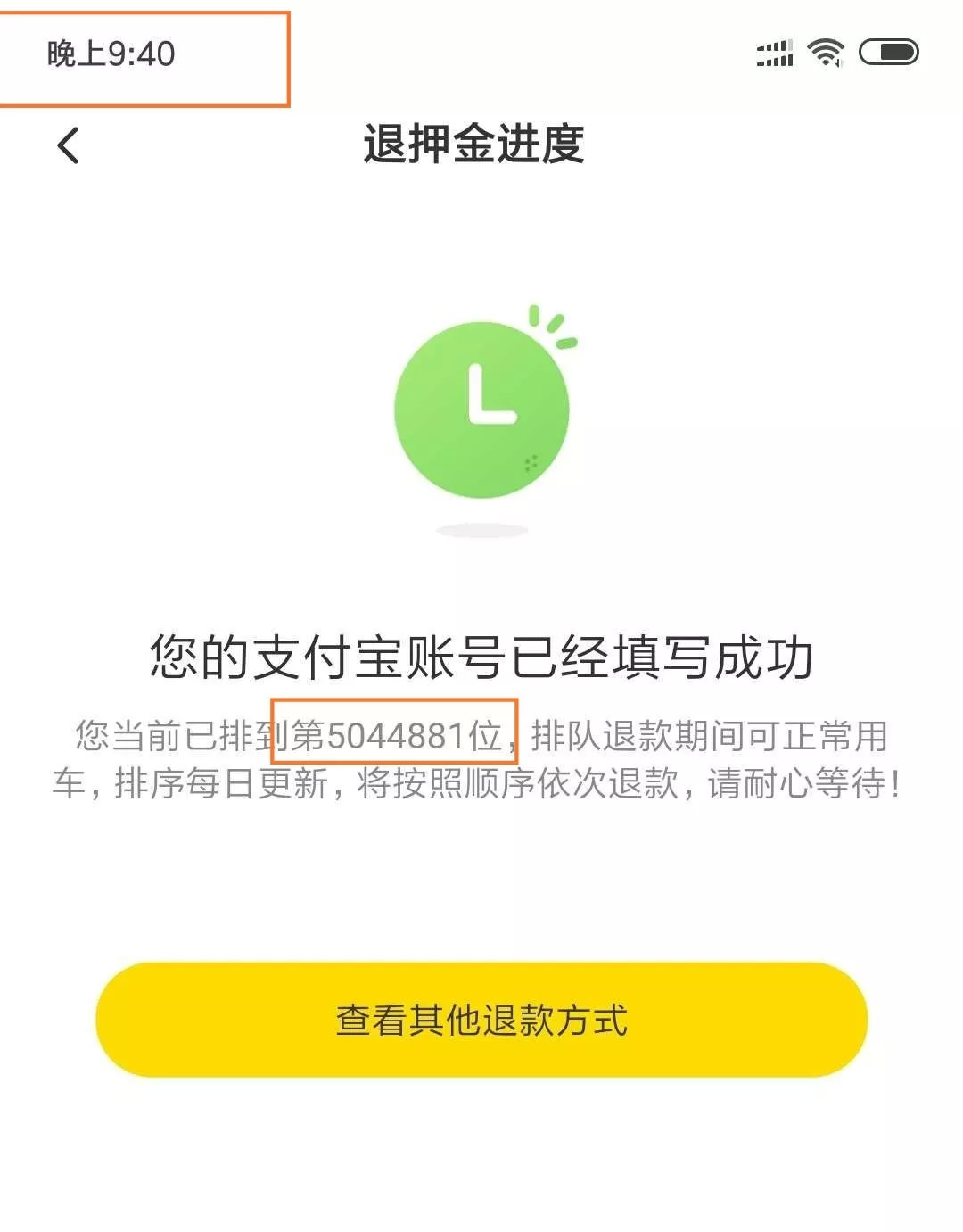 此前的那位排名980多万的90后男孩再次向记者展示了自己的排位号,40分钟时间内比之前提前了79个。旁边一位用户无奈表示,如果按照每天退1000人,轮到自己时就要到30年后了。“我觉得小黄车能否活过半年还是个问题。”