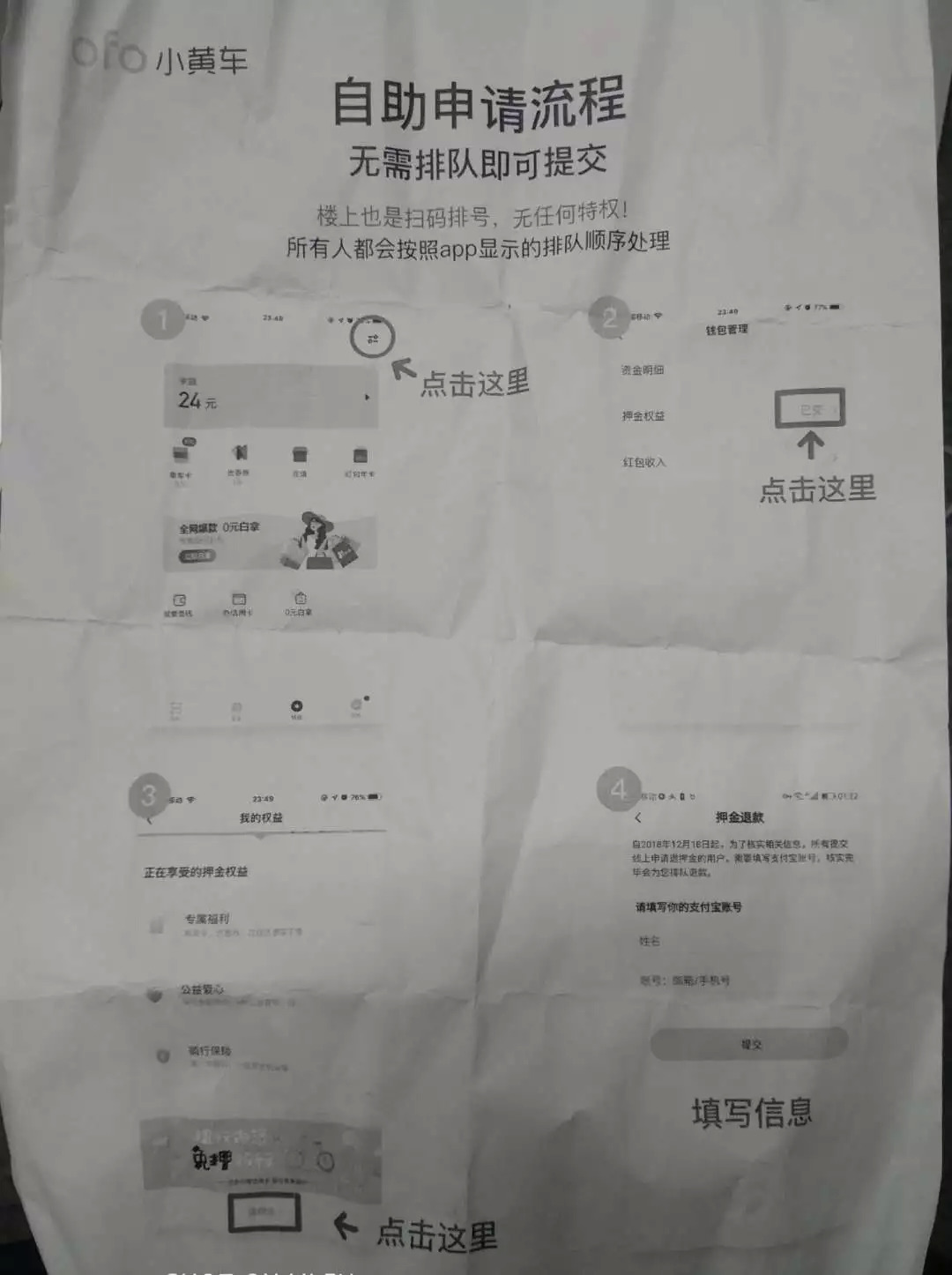 现场,ofo工作人员发放的自助申请流程图