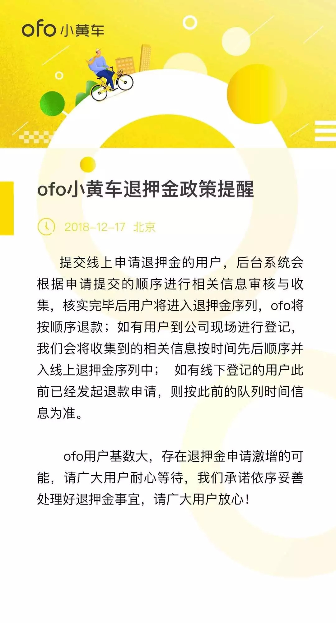 ofo于17日发布在官方微信上的《ofo小黄车退押金政策提醒》
