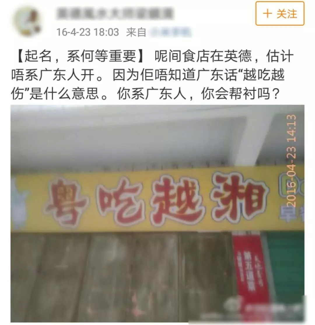 一家“粤吃越湘”的店,店主明明是想表达自己的店有湘菜风格,但从粤语里读出来就成了“越吃越伤”。