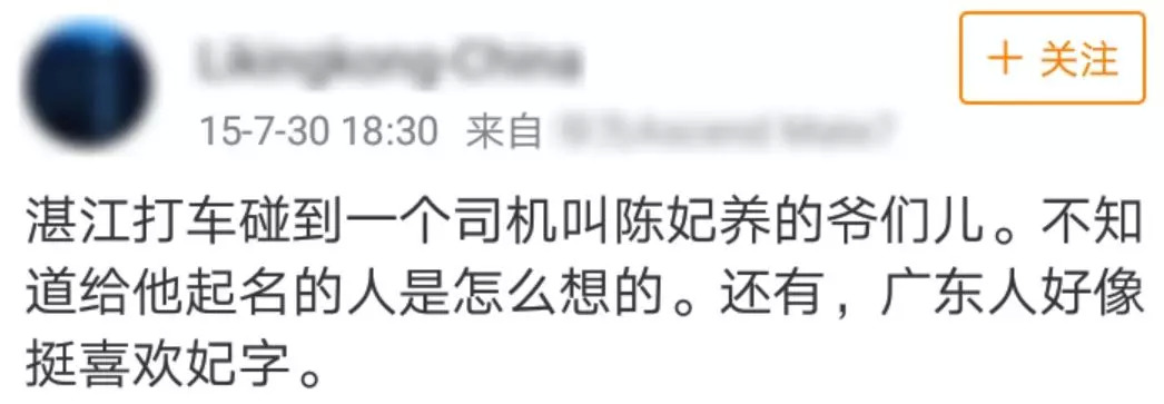 当然,也有一些没什么特殊含义的。比如,假如你是女孩子,刚好前面又有哥哥姐姐,很可能就被起名为“妹”或“小妹”。据统计,光是广州,就有2404个叫梁妹、陈妹的。