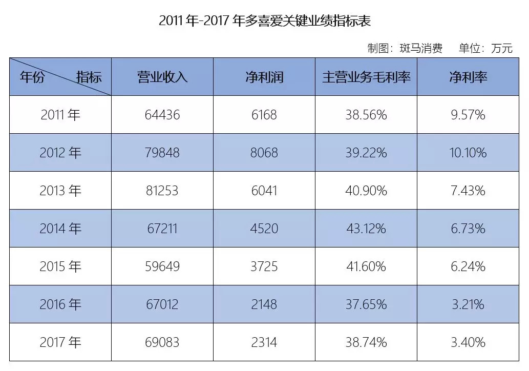 上市前,多喜爱营业收入七八个亿,净利润六七千万;2015年上市后,营业收入下滑至五六个亿,净利润跌至两千万级别。上市3年,净利率直接缩水2/3。