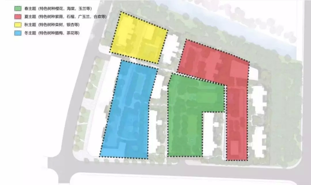 整个小区的景观分为春夏秋冬四个园林主题,而与主题相映成趣的,便是配之以不同花色的鲜花,花开四季,即为四园。