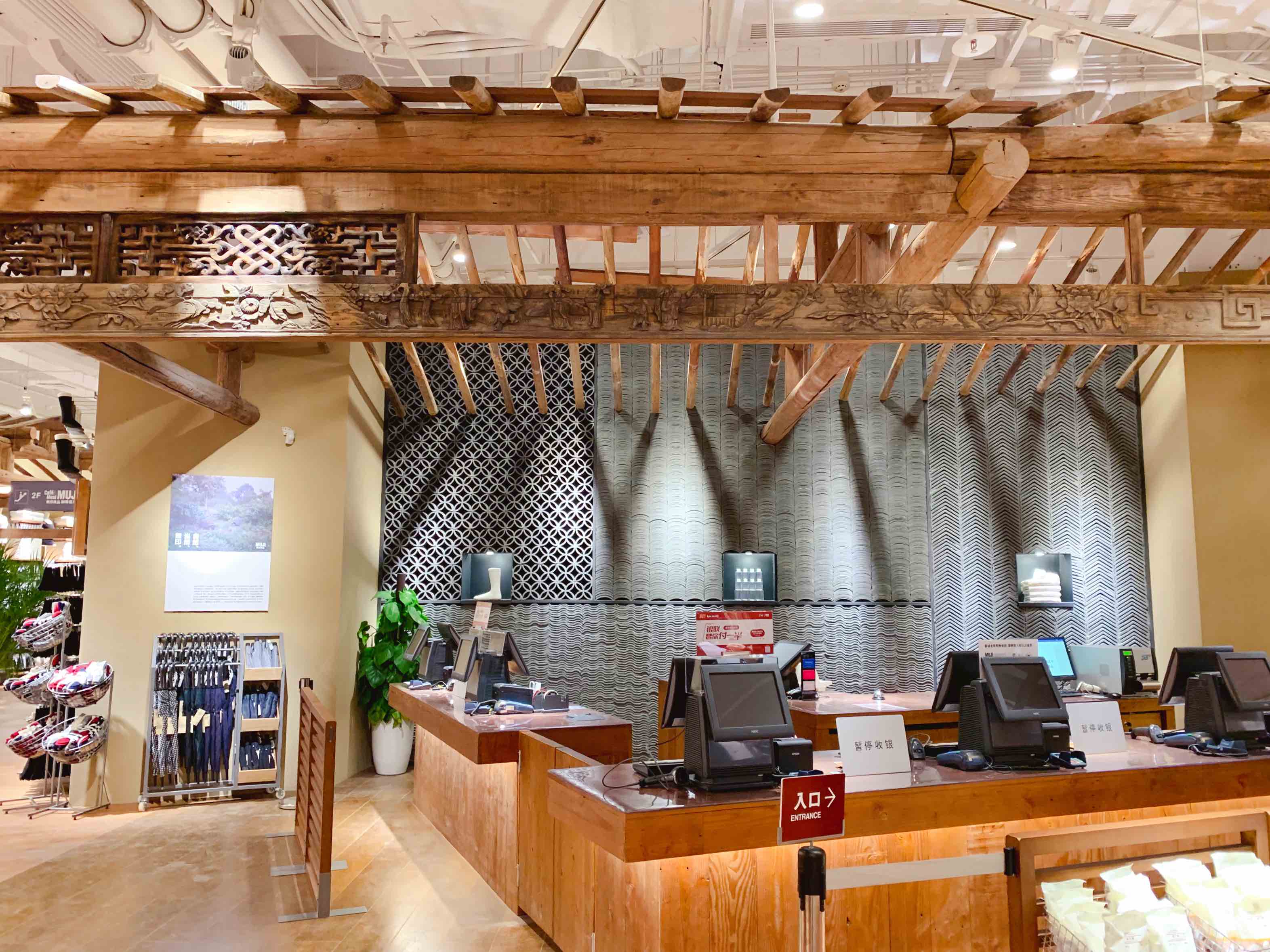 两层楼的空间设计主题不同。一层楼由于销售服饰、美妆类产品,因此主题被定为“家”。整层楼可以见到中国旧式民宅常用的砖瓦、梁柱等材料。无印良品希望借此诠释属于六朝古都南京的文化与美。
