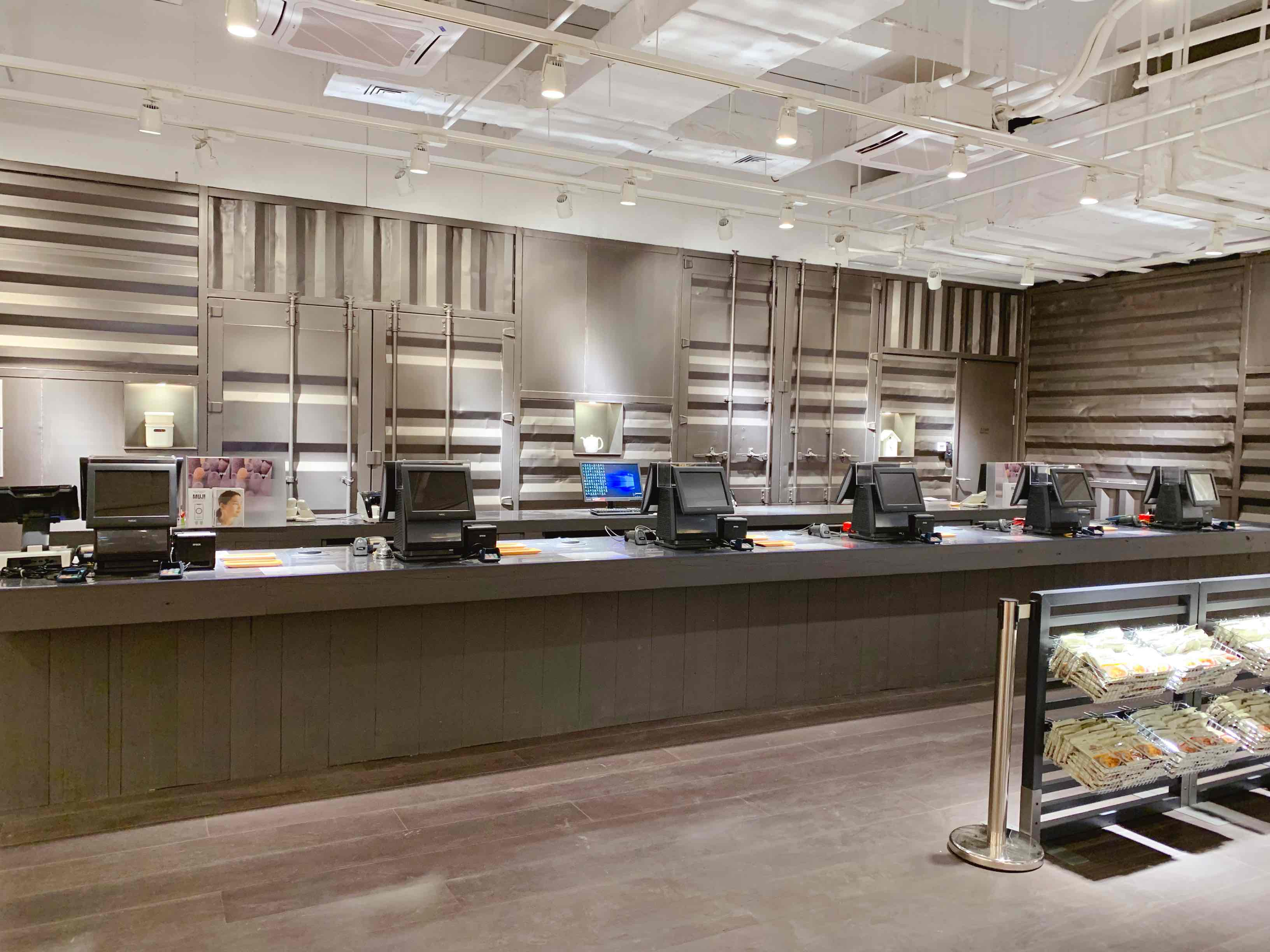 二楼的空间显得更为现代和理性。在这个主要销售文具、书籍、家具、家居用品、食品的空间,南京近郊货运码头的废旧集装箱及搬运木箱被作为了主要的装饰材料。可以看到二层收银空间的背景墙全部都由集装箱钢板铺成,而分隔区域的工作交给了被刷成深木色的木箱部件。