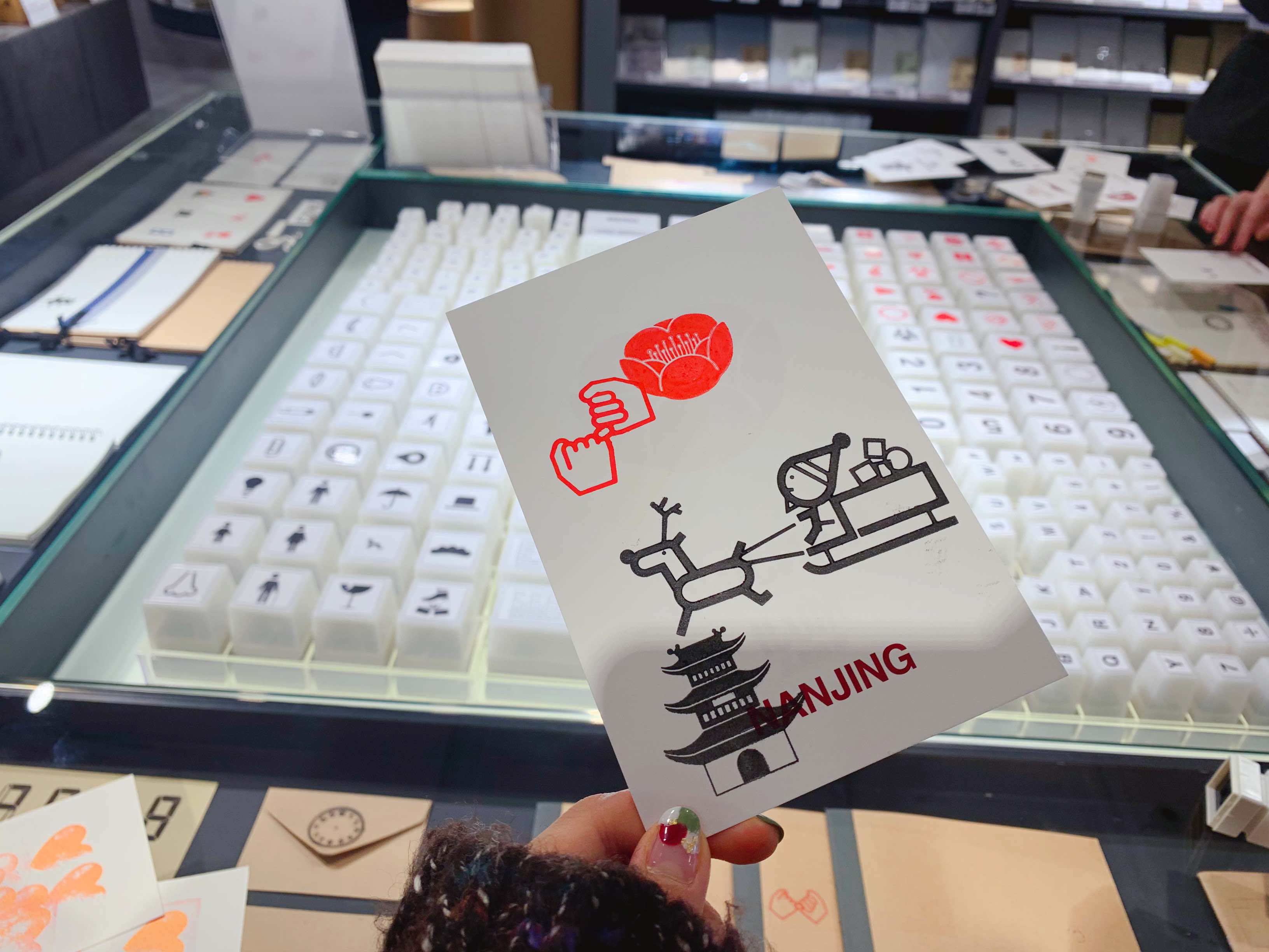 一上到二楼还能看到MUJI YOURSELF区域。南京店的MUJI YOURSELF提供印有南京市花梅花以及古城楼的明信片。明信片上的梅花和古城楼也被做成了该店限定供应的印章。如果想要在这家店打卡,或是寄出一份有特色的礼物,这个区域不容错过。