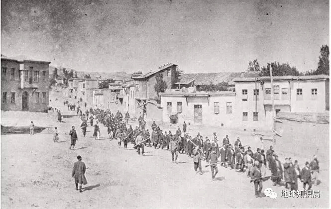 亚美尼亚平民在奥斯曼帝国士兵的指引下