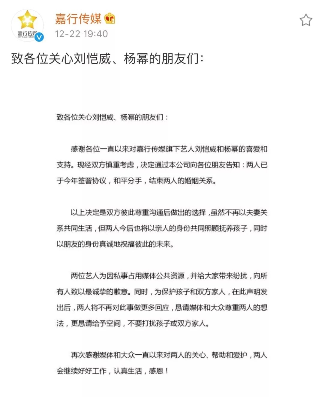 12月22日,沉浸在冬至氛围中的大众吃到了意料之外,却又情理之中的瓜。嘉行传媒代表杨幂和刘恺威两方发布离婚声明,称“双方经过慎重考虑,已于今年签署协议,和平分手,结束两人婚姻关系。今后将以亲人身份共同照顾抚养孩子小糯米。”宣告4年婚姻结束。