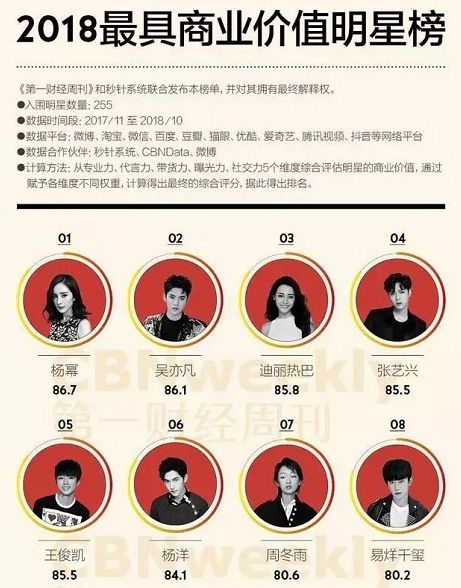 而在官宣的前几日,据《第一财经周刊》发布的《2018最具商业价值明星榜》显示,杨幂荣登榜首,力压吴亦凡、张艺兴、鹿晗等人,旗下艺人迪丽热巴位居第三位。