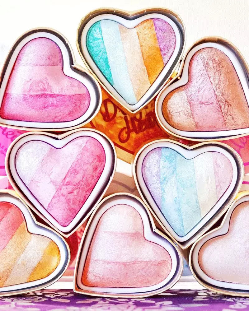 显色度还蛮高的,适合高光狂热粉。有一点飞粉,但是好玩和创意大过产品本身嘛。除了高光,还有腮红和修容做成了心形~