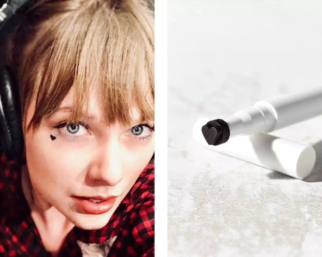 这个牌子是做创意美妆开始的,很多好玩的小工具。比如霉霉之前用了她家的爱心纹身笔,在脸上像盖印章一样用就行,省去了自己用眼线液画的麻烦。