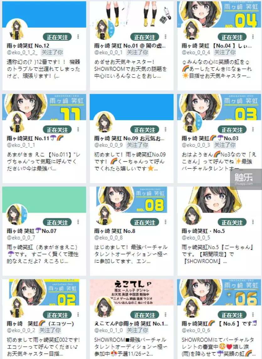 从No.01到No.12,12个“雨ヶ崎笑虹”的推特账号