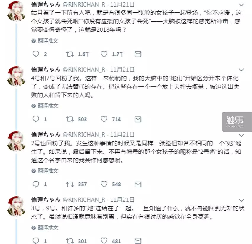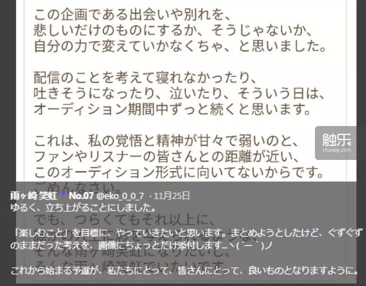 被淘汰的个体们将不能再使用自己的推特账号,也不能再在Showroom上直播——在被淘汰的那一刻,她们的时间就静止了。这种感觉既残酷又微妙,一条评论说:“作为观众,我们知道有11个叫做‘笑虹’‘林檎’的个体被剥夺了名字,也没有留下多少存在过的痕迹(Showroom平台直播不会留档),最终我们看到的5个人,身上都有着十多个影子。”