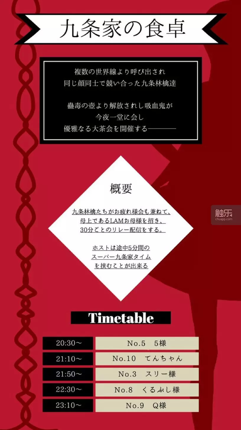 林檎05制作的邀请函。“从复数的世界线中出来,用相同的面貌互相竞争的九条林檎们,从这蛊毒罐子中解放出来的吸血鬼们,今夜相聚一堂。优雅的大茶会即将开始。”因为九条林檎的设定是吸血鬼,所以邀请函也是符合这个设定的。图中时间栏右侧则是林檎们的昵称
