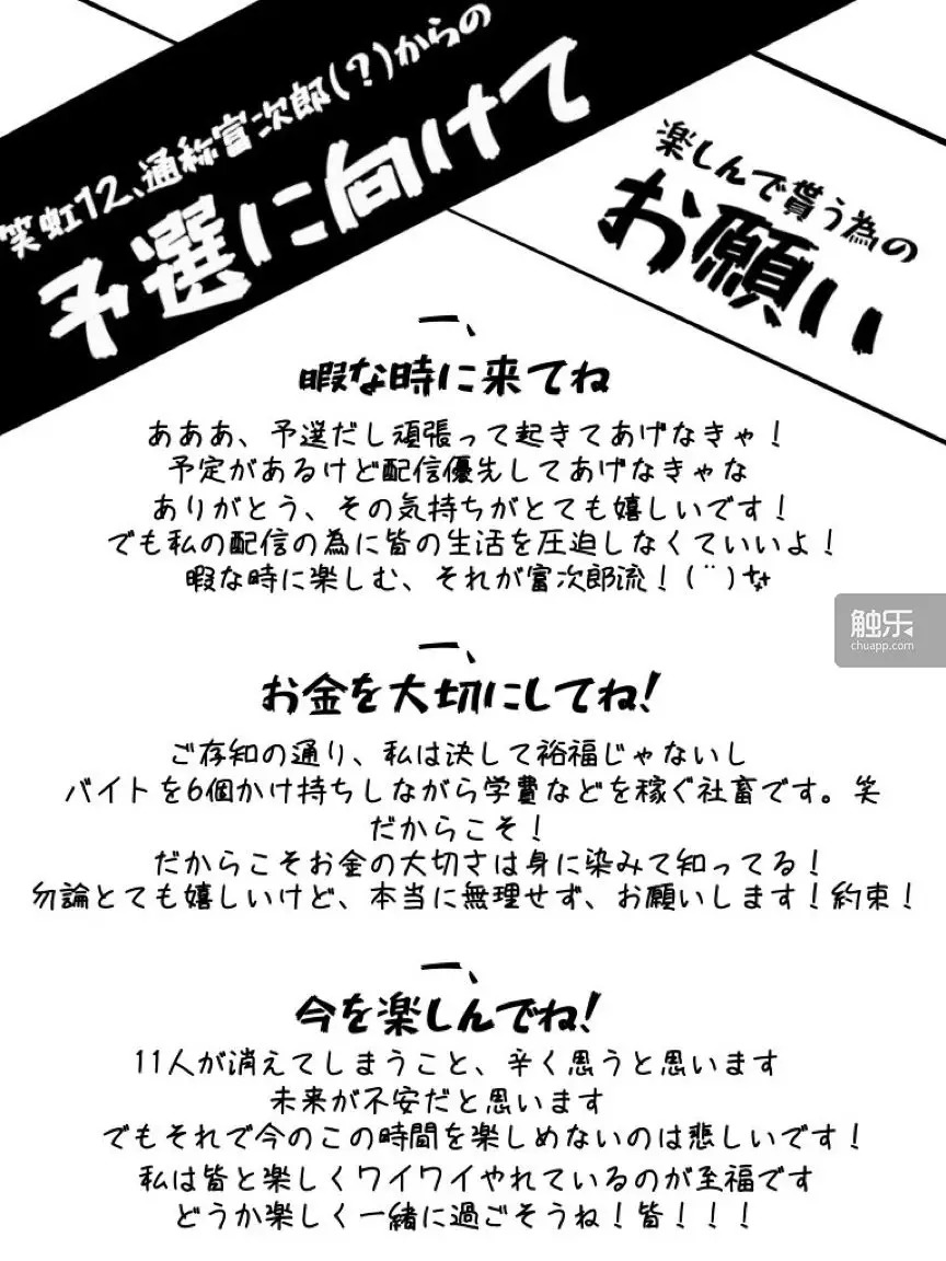富次郎直播三戒律:一、请在闲暇时间过来!……不可以为了看我的直播压迫大家的生活哦!闲暇时享受,那就是富次郎流!二、钱很重要!正如你所知的,我绝不是什么富裕的人,而是为了学费身兼6份打工的社畜(笑)。正因为如此,我才知道金钱的重要性!虽然理论上很高兴,但是真的不要勉强,拜托了!说定了哦!三、好好享受当下吧!对于11个人消失的事情,对于未来的不安都让我很难过。但是,因为如此大家就不能享受现在的快乐,我同样很难过!与大家一起热热闹闹地在一起是最幸福的,一定要快乐地一起度过!大家!!!