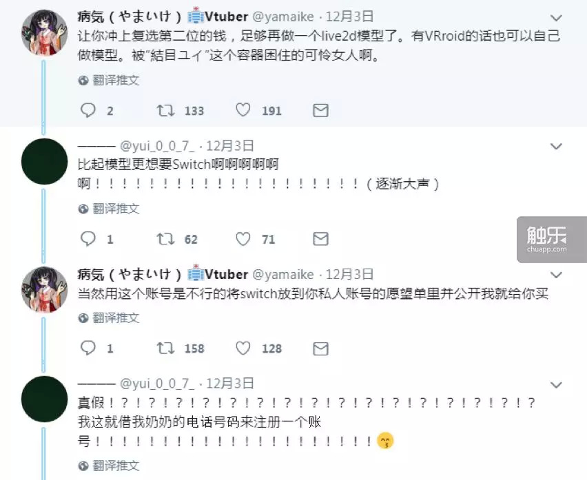 也就在这个时候,另一个VTuber,有6万粉丝的DeepWebUnderground(DWU)发现了这件有趣的事,并转发了他们关于Switch的对话。可能是因为DWU转发的缘故,结衣07几小时后就在自己的私人账号中收到了一条信息:“你就是结衣07吧?”结衣07惊讶地表示,既然被发现了,那就不能再在这里玩下去了。