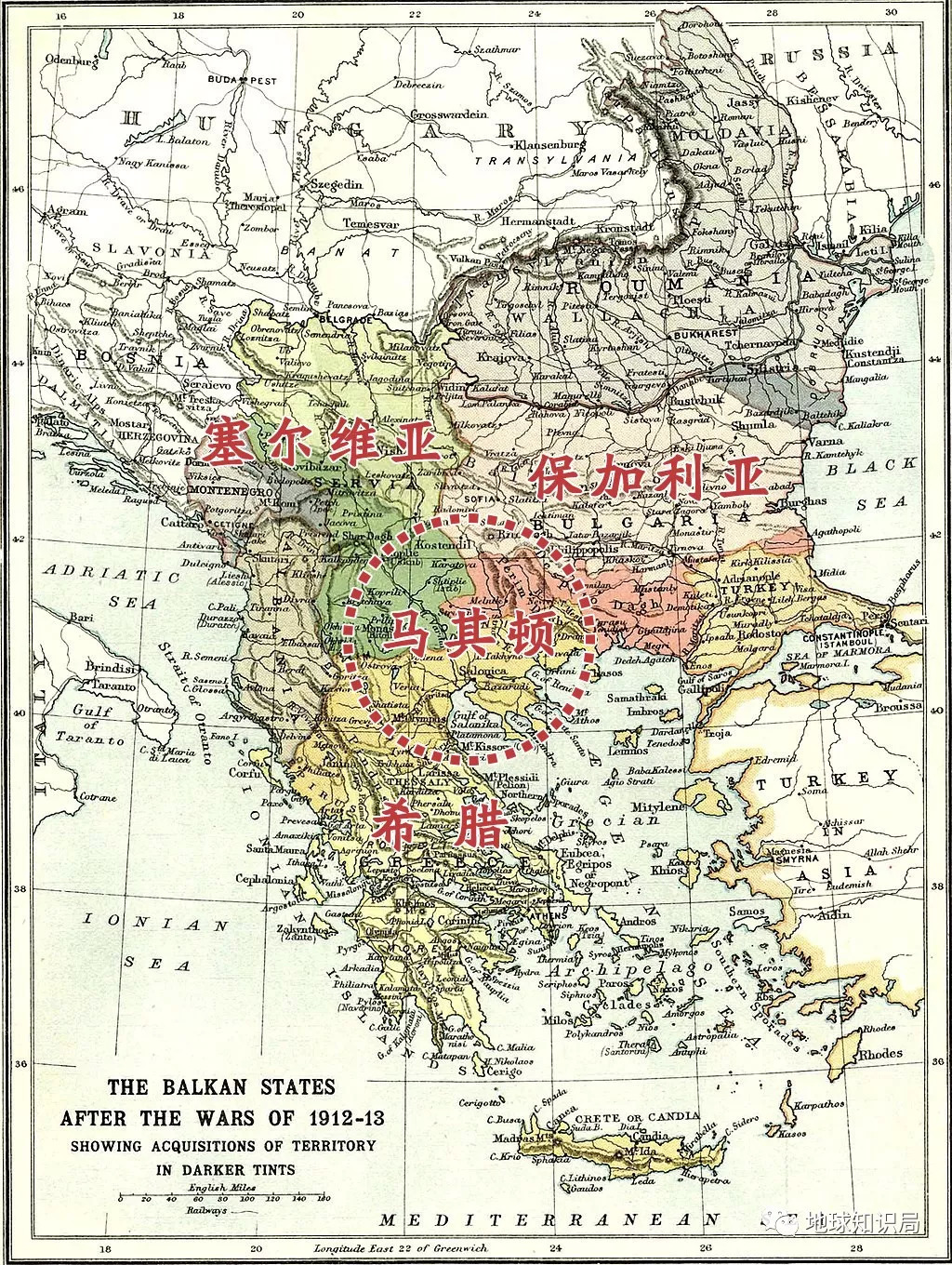 历经1912-1913年两次巴尔干战争后,奥斯曼土耳其被赶出巴尔干半岛,但马其顿族始终未能获得独立建国机会。传统地理概念上的马其顿被一分为三,东部归保加利亚(皮林马其顿)、南部归希腊(爱琴马其顿)、西北部归塞尔维亚-克罗地亚(瓦尔达尔马其顿)。