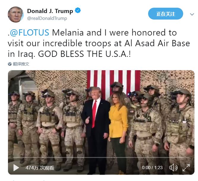 特朗普携第一夫人梅拉尼娅于12月26日访问伊拉克西部的阿萨德(Al-Asad)空军基地。这次访问没有事先公布,由于对会面地点存在分歧,特朗普也没有与伊拉克总理阿卜杜勒-迈赫迪碰面。