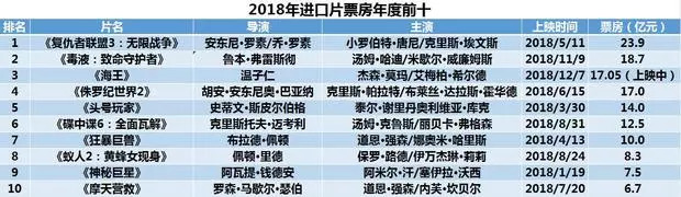 回顾2018年的好莱坞进口片,《复仇者联盟3》一骑绝尘狂揽23.9亿,位列进口片内地票房冠军,《毒液:致命守护者》以18.68亿票房位列第二,目前还在上映的《海王》票房已破17亿,在12月结束前稳稳闯进前三名。《侏罗纪世界2》和《头号玩家》分别以16.95亿和13.96亿票房位居进口片排名第四、五位。