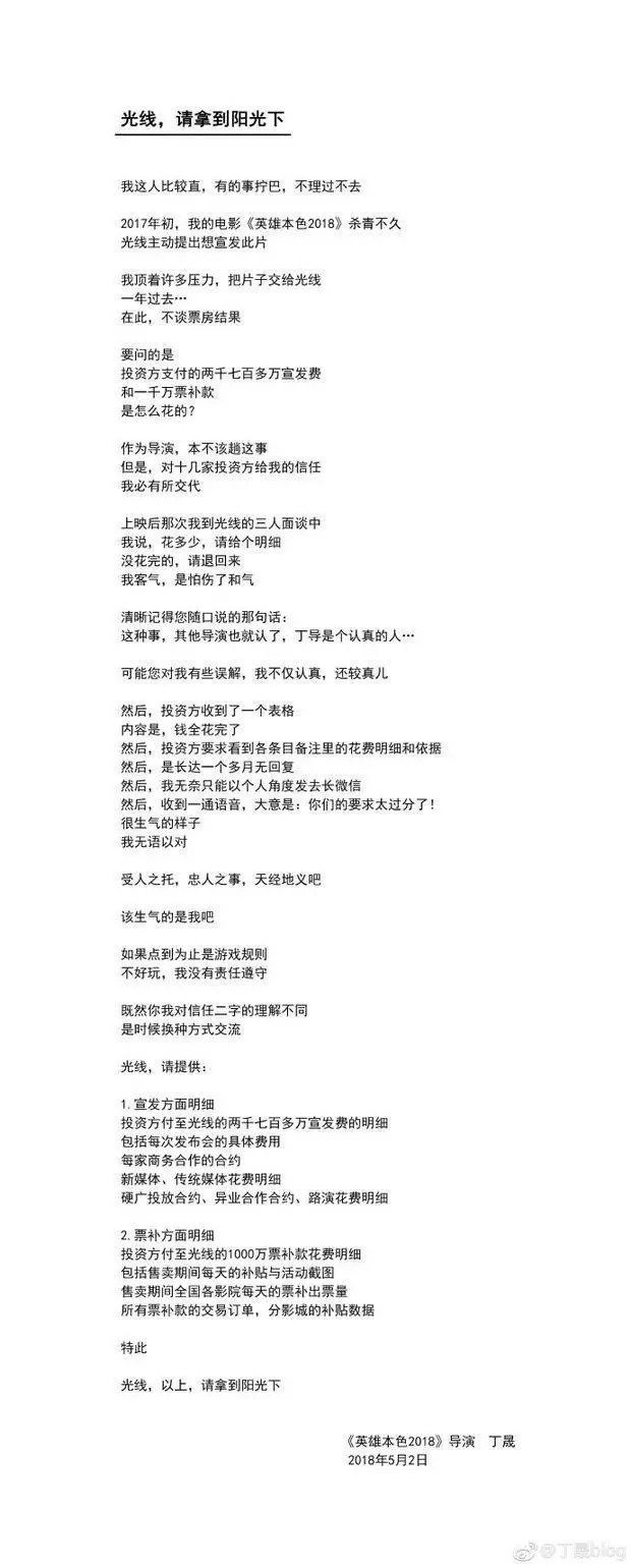 除了像《冰封侠》这样单纯为了博眼球的“官撕男主”事件,还有丁晟导演因为对《英雄本色2018》票房不满,和光线公司打起口水战,丁晟多次公开发声征询2774万宣发费和1000万补票款的具体去向,但被光线强硬拒绝。