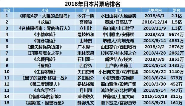 不过今年日本片数量虽多,但票房成绩却表现一般,全年内地票房最高的日本片是《哆啦A梦:大雄的金银岛》2.09亿,但远不如2015年上映的《哆啦A梦:伴我同行》收获5.3亿票房。值得一提的是,《小偷家族》由于有戛纳金棕榈大奖加持,在内地顺利斩获9674万票房,成为目前内地最卖座的日本真人电影。