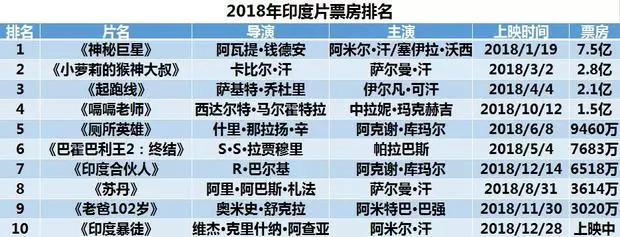 印度片如《小萝莉的猴神大叔》《起跑线》和《嗝嗝老师》分别收获了2.86亿、2.1亿和1.49亿的票房成绩。另外五部印度片票房未过亿,《厕所英雄》9460万,《巴霍巴利王2》7683万、《印度合伙人》6217万,《苏丹》3614万,《老爸102岁》3019万。12月28日上映的《印度暴徒》或许会是2018年印度片大卖的最后希望,毕竟这部电影由阿米尔·汗领衔主演,“米叔”甚至来到中国多个城市做宣传。