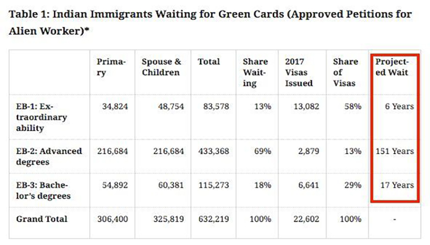 大多数留美党们很憧憬绿卡在手的状态,然而现实中,漫长的绿卡排期令人望而却步,“随缘”成了主流态度。在排期这件事上,印度人和中国人成了“难兄难弟“。据美国移民局统计数据,截止2018年5月,共有395,025份职业移民绿卡正在等待排期,其中三十万份的申请来自印度。美国现行职业移民配额是140,000个,每个国家所占比例不能超过7%。其中,EB-2申请数占总数的28.6%,而走EB-2通道的印度籍申请人需要排期151年。