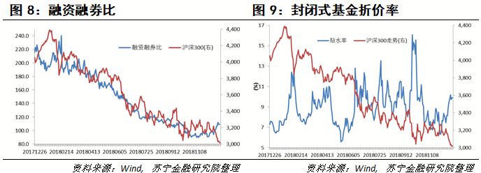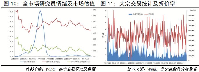 在众多市场参与主体中,我们选择了最为理性的两类主体(研究员和大宗交易参与者)的相关数据来观察投资者情绪(见图10、图11)。从卖方推荐指数上来看,第四季度卖方推荐指数在10月底达到近三个月顶部,而在10月后,卖方推荐指数呈现直线下滑状态,目前仍处于较低水平。从大宗交易上看,目前交易额较第三季度有小幅提升,折价率先降后升。