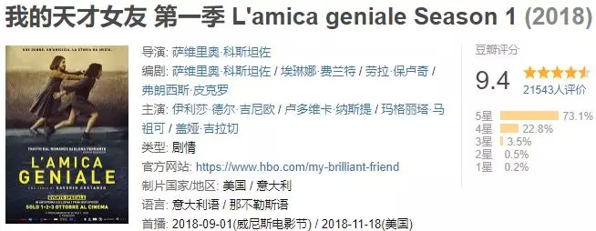 四部曲中的第一部《我的天才女友》被HBO搬上荧幕,随即在豆瓣拿到9.4、IMDb8.6、烂番茄新鲜度94%的高分。