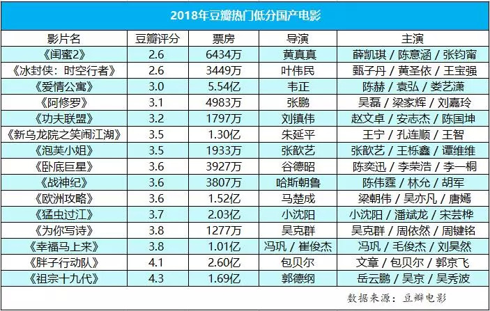新剧百晓生从2018年的豆瓣低分片中,选出了15部热度比较高的国产烂片,制作了以下的2018年国产烂片榜——