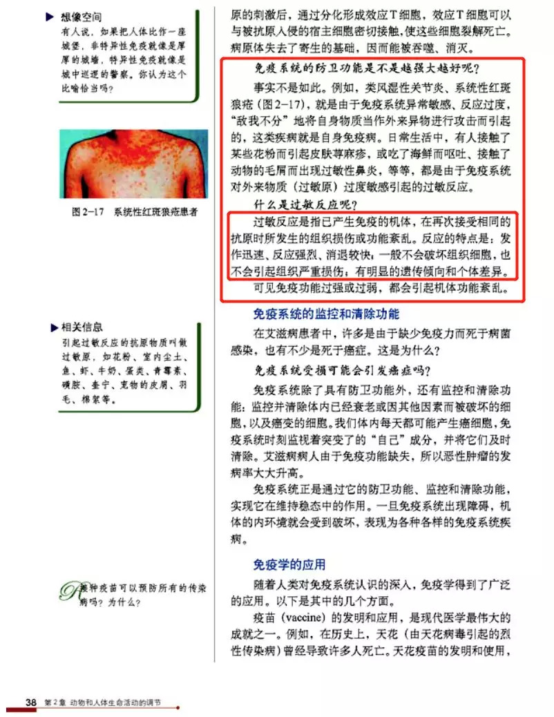 我们翻到教材第 38 页,动物和人体生命活动的调节这一章,可以清晰地看到过敏反应是一种免疫系统疾病。
