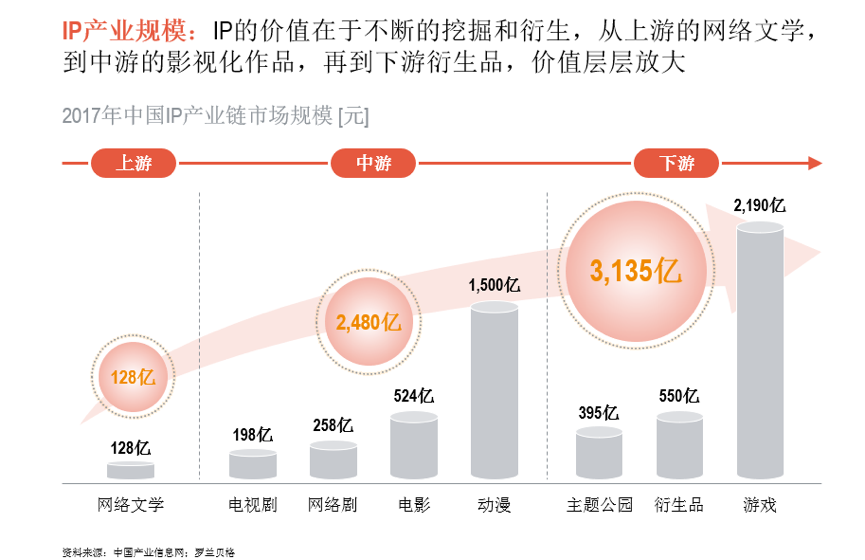 IP的巨大价值在于不断挖掘和衍生出不同的商业形态,覆盖不同受众,创造独特价值,彼此间通过IP核心的价值观交互强化,从上游的网络文学,到中游的影视、动漫作品,再到下游主题公园、游戏、衍生品,IP价值层层放大。