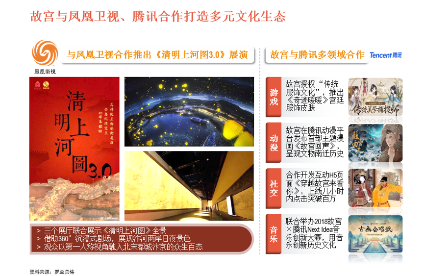 除文创业态外,故宫博物院与凤凰卫视签署战略合作框架协议,联袂打造高科技互动展《清明上河图3.0》,观众以第一人称视角体验北宋都城汴京的众生百态,成为长卷中的人物; 2018年7月,腾讯与故宫博物院宣布开展长期战略合作,以互联网技术为基础,共建泛娱乐文化生态(图I)。