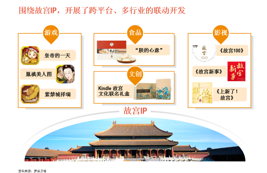 故宫借助互联网思维,开展了跨平台、多行业的联动开发,实现品牌方与IP方的双赢(图K)。2013年,故宫IP切入游戏市场,与腾讯合作,陆续推出《胤禛美人图》、《皇帝的一天》等五款游戏类APP。2016年和2017年,故宫打造纪录片《我在故宫修文物》和热播节目《国家宝藏》,风靡一时。此外,故宫食品“朕的心意”旗舰店入驻天猫,独家首发“清代古方膳食”,联合Kindle推出Kindle Paperwhite X 故宫文化定制保护套及联名礼盒,火爆网络。