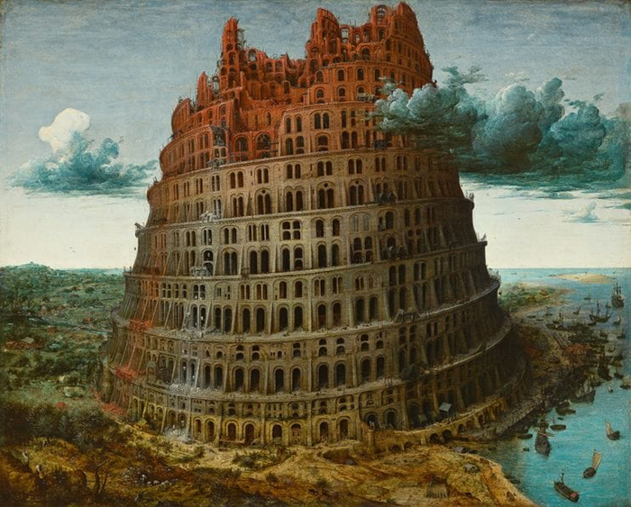 《巴别塔》是勃鲁盖尔以圣经故事为题材所创作的系列作品之一,与众不同的是,勃鲁盖尔所描绘的旧约故事往往是处在上帝介入之前。从画面上看,这座巨塔的建造工程似乎进展得非常顺利,没有灾难降临的迹象,人们还不知道他们膨胀的野心即将受到上帝的谴责和惩罚,他们的共同语言被搅乱成多种语言,彼此不能沟通和理解,建塔的工程便无法再进行下去。