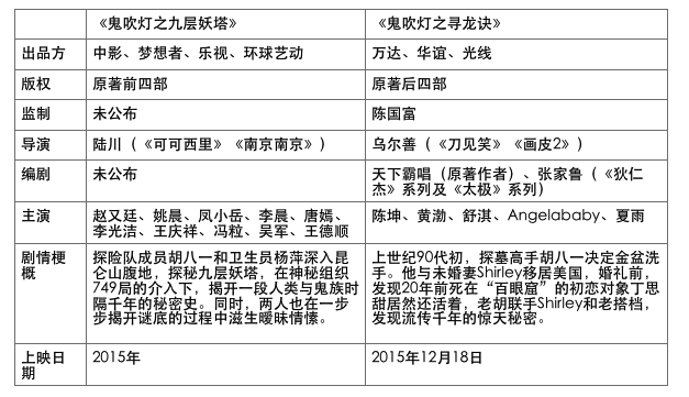 今年,将有两部根据热门小说《鬼吹灯》改编的电影上映,分别是中影、梦想者电影、乐视共同出品,陆川导演,姚晨、赵又廷主演的《鬼吹灯之九层妖塔》;和万达、华谊、光线共同出品,乌尔善导演,陈坤、舒淇主演的《鬼吹灯之寻龙诀》。