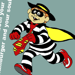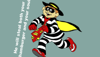 “汉堡神偷”是麦当劳自创的卡通人物,穿着黑白条纹衫,眼戴黑色眼罩,因为偷汉堡而入狱成为囚犯。它在2002年起就没有再出现在麦当劳的全球电视广告中,一起消失的还有紫色的奶昔大哥“滑嘟嘟”和鸡姐“小飞飞”。