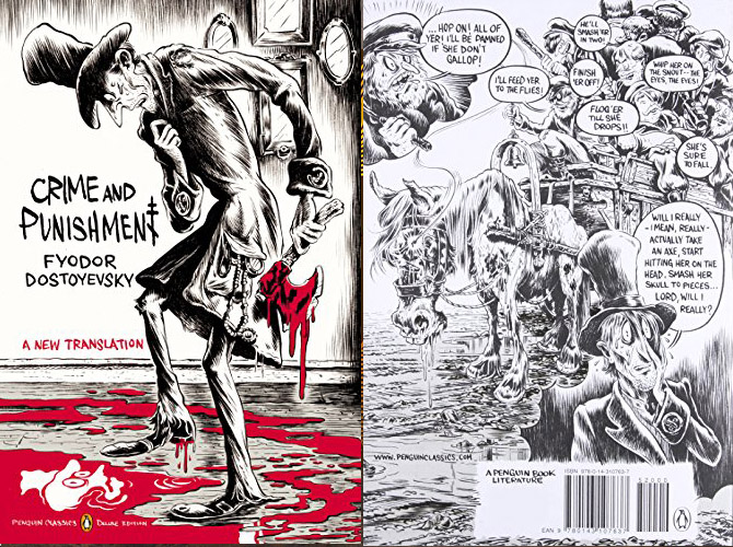 经典豪华版《罪与罚》封面上的拉斯柯尔尼科夫被插画师设计成了一个“无知的蠢货”,被地上血泊映出的自己的丑恶面容吓坏了,这也恰好与小说的内容相吻合:拉斯柯尔尼科夫不是杀人犯,而是个懦夫。封底的画面是小说主人公从儿时的梦中醒来,梦里一群施虐成性的暴徒在折磨一匹疲累的老马,主人公认为自己的罪行与这些暴徒如出一辙。如此一来,封底恰好形成了对封面流露出的恐惧与懊悔的投射。