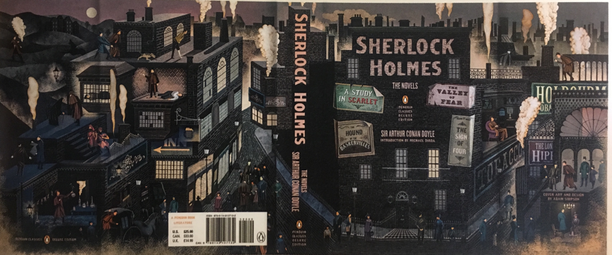 插画师亚当·辛普森(Adam Simpson)所绘的《福尔摩斯探案集》经典豪华版封面重现了让人好奇的维多利亚时代:十九世纪90年代的伦敦,作为一个后工业革命的世界,遍布砖石建筑、石板小径和形形色色的小人物。封面设计中充满了烟、黄色浓雾以及疑案的元素,几乎在每个阳台、角落或房屋内,都藏着书中四个故事里的冒险场景。