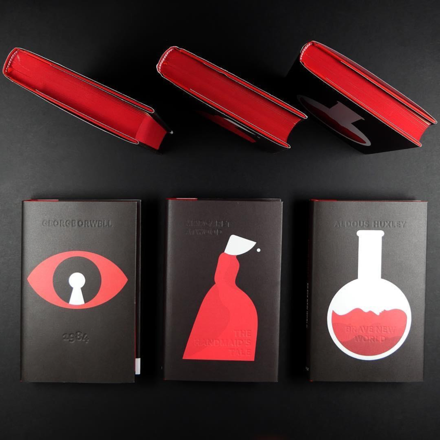 2017年,反乌托邦小说再次受到读者青睐,企鹅挑选了三本反乌托邦小说的代表作——玛格丽特·阿特伍德《使女的故事》、赫胥黎《美丽新世界》、奥威尔《1984》,由设计师诺玛·巴尔(Noma Bar)重新设计,采用黑白红三色极简设计,切口处也被涂成了刺眼的血红色。