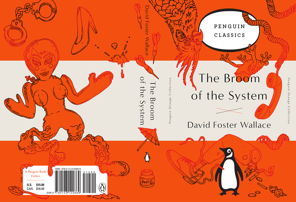 “企鹅经典”历史上的“三段式”封面设计辨识度最高,而巴克利试图玩转和颠覆企鹅历史上这一著名设计。他将“企鹅橘色”系列变得更当代、更时髦,为封面增添各种意象,呈现出了互动立体的效果。巴克利请来插画师艾里克·尼奎斯特(Eric Nyquist)绘制这些意象,艾里克表示:“想到自己将会从视觉上侵犯经典设计,还有斯坦贝克、华莱士、凯鲁亚克等名家著作,我便激动不已。”他在大卫·华莱士《系统之帚》的封面上绘制了离经叛道的立体画,展现出了恐怖、荒谬和禁忌的味道——溅泼的荧光色、手铐、充气娃娃边上滴落的污泥,在某种程度上都有着80年代色情片的意味。