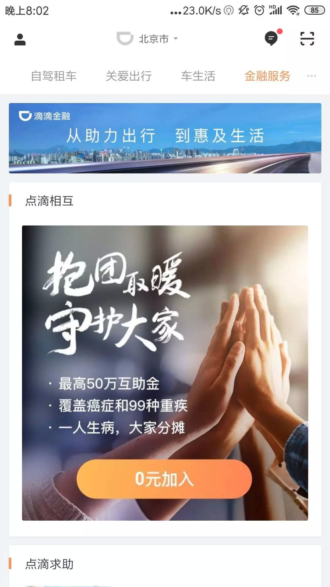 在滴滴“金融服务”页面上,已经上线重大疾病互助产品“点滴相互”、大病筹款产品“点滴求助”,以及其他如健康险、车险、理财产品等板块。