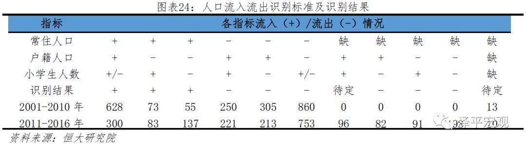 综合常住人口、户籍人口、小学生三个指标,人口流入流出的具体识别标准如下:1)若常住人口、户籍人口同时流入,不管小学生流入流出,均识别为人口流入。2)若常住人口、户籍人口同时流出,不管小学生流入流出,均识别为人口流出。3)若常住人口流入、户籍人口流出、小学生流入,则识别为流入。4)若常住人口流入、户籍人口流出、小学生流出,识别为流入。这种类型可能是一些传统劳务输出地区,部分劳动力回流,但同时也有部分外出劳动力迁出户籍到就业地安家。当然,也可能是因为统计偏差,比如山西就有不少行政单元的人口增长率仅略高于自然增长率不到0.1个百分点。5)若常住人口流出、户籍人口流入,无论小学生流入流出都识别为人口流出,都识别为人口流出。比如,当前东部部分地区同时存在外来人口回流和本地化两种现象,即常住人口流出、户籍人口和小学生流入。6)若常住人口缺失、且户籍人口和小学生均流出,则识别为流出。从有完整数据的地区看,2001-2010年这种情况流出概率超过90%,在2011-2016年流出概率接近80%。7)若常住人口缺失、户籍人口和小学生只有一个流出,也识别为人口流出。从2011-2016年有完整数据的地区看,该种类型流出概率高达约七成。8)若常住人口缺失、且户籍人口和小学生均流入,从历史经验看难以判断其常住人口是否流入,2001-2010年流入概率仅36.9%,2011-2016年为52.6%,因此将这种类型地区列为待定。