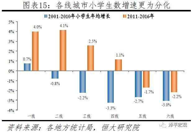 在外来人口向一二三线城市本地化的背景下,小学生增速的城市分化更为明显。2001-2010年,在全国小学生数年均增长-2.7%的背景下,一二三线城市小学生数年均增速分别为0.7%、-0.8%、-2.2%,四五六线城市小学生年均增速分别为-3.3%、-2.7%、-3.0%,分线城市最大值和最小值的差为4个百分点。而到2011-2016年,在全国小学生数年均增长为0的背景下,一二三线城市小学生数年均增速分别为4.0%、4.1%、2.5%,而四五六线城市小学生年均增速分别为1.1%、-1.7%、-2.2%,分线城市增速最大值和最小值的差扩大到6.3个百分点,一线城市因学位供需紧张而增速略低于二线城市。