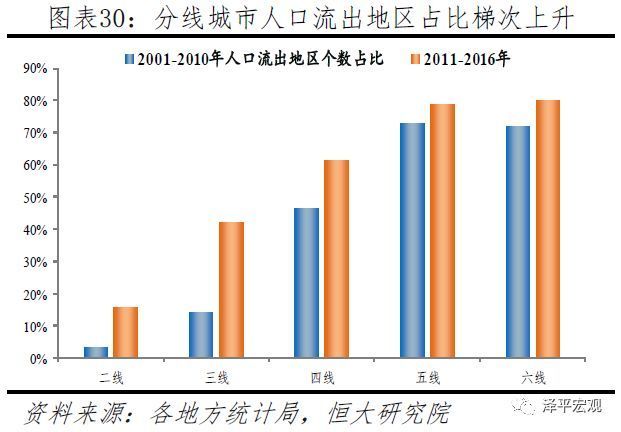 分线看,二线城市人口流出地区个数占比从3.1%增至15.6%,三线城市从14.1%增至42.2%,四线城市从46.4%增至61.2%,五线城市从72.9%增至78.8%,六线城市从71.1%增至79.9%。一线城市目前整体保持人口持续流入,但北京、上海因严控人口近几年常住人口已开始流出。二线城市人口流出个数从1个增加到5个,占全部二线城市个数的比例从3.1%增至15.6%。三线城市人口流出个数从9个增加到27个,占比从14.1%上升到42.2%。四线城市人口流出个数从116个增加到153个,占比从46.4%增加到61.2%。五线城市人口流出个数从444个增加到480个,占比从72.9%增至78.8%。六线城市人口流出个数从801个增加到892个,占比从71.7%增至79.9%。其中,三线城市近期人口流出地区个数占比显著增加28.1个百分点,远高于二线的12.5、四线的14.8、五线的5.9、六线的8.1个百分点。