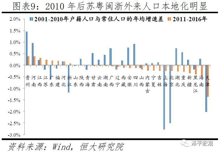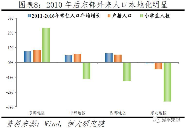 2010年左右以来,部分人口回流中西部,东部地区面对用工压力主动推进大学毕业生、技能人才等外来人口本地化,户籍人口和小学生增速明显加快,东北地区人口加速流出。2009年在长三角和珠三角地区务工的外出农民工占全国外出农民工比例分别比上一年下降2.4%和7.6%,2009年下半年东部沿海地区出现明显的“用工荒”;2013-2017年高校毕业生在东部地区就业规模虽持续增长,但占比从65.7%降至56.7%(参见麦可思研究院《中国大学生就业报告》)。面对用工压力,东部地区主动深化户籍制度改革、吸引外来人口安居乐业。2011年起以鞋服产业闻名全国的晋江在福建率先实行零门槛“居住证”制度,并于2013年率先实行“无房也落户”政策。在2014年国务院要求进一步推进户籍制度改革后,2015年福建宣布全面放开除福州、平潭、厦门外地区的落户限制;广东宣布,除广州深圳外,放开直系亲属投靠,放宽大专以上(含大专)学历毕业生及技能人才、特殊专业人才入户条件等。2011-2016年,东部、中部、西部、东北地区常住人口分别年均增长0.75%、0.48%、0.63%、-0.06%,常住人口占比分别变化0.4、-0.2、0.1、-0.3个百分点。尽管东部地区常住人口增长率明显下降,但其户籍人口和小学生增长率却不降反升。2011-2016年,东部、中部、西部、东北地区户籍人口分别年均增长0.84%、0.58%、0.53%、-0.44%,户籍人口占比分别变化0.5、0、-0.1、-0.5个百分点。东部、中部、西部、东北地区小学生数分别年均增长2.32%、-1.10%、-1.25%、-2.64%,小学生数占比分别变化4.9、-1.9、-2.2、-0.8个百分点。其中,2014-2016年东部地区在常住人口年均增速较2011-2013年下降0.06个百分点,但户籍人口年均增速反而上升0.29个百分点。