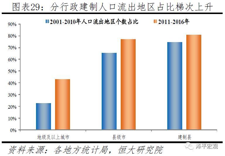 从行政建制看,地级及以上城市人口流出地区个数占比从22.6%增至42.9%,县级市从65.3%增至76.9%,建制县从74.8%增至80.9%。地级及以上城市人口流出地区个数从2001-2010年的65个增至2011-2016年的123个,占比从22.6%增至42.9%;县级市人口流出地区个数从220个增至259个,占比从65.3%增至76.9%;建制县人口流出地区个数从1086个增至1175个,占比从74.8%增至80.9%。其中,地级及以上城市人口流出地区占比上升了20.2个百分点,远高于县级市、建制县。