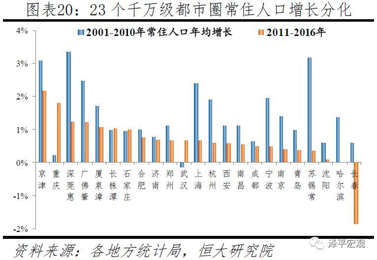 从都市圈内部看,除广佛肇、厦漳泉、京津外,多数大都市圈内的县(县级市)人口整体净流出,表明人口当前仍主要向多数大都市圈内中心区域集聚。绝大多数县及县级市为五六线城市,2011-2016年全国地级市辖区以外的县市常住人口年均增速为0.25%,远低于同期全国总体平均水平0.51%。除去县(县级市)常住人口缺失的京津、济南、长春、哈尔滨等4个大都市圈,2011-2016年19个千万级大都市圈的县(县级市)常住人口年均增速也仅为0.28%,这意味着多数大都市圈仅市辖区人口流入。粗略地与本省人口自然增长率相比较,2011-2016年这19个千万级大都市圈中县市常住人口净流入的仅有厦漳泉、广佛肇,年均增长率分别比本省自然增长率略高0.04、0.06个百分点;石家庄、深莞惠、苏锡常的县市人口年均增长率则分别比本省低0.04、0.05、0.05个百分点,基本接近流入流出平衡。此外,京津都市圈县(县级市)常住人口数据缺失,但2011-2016年县(县级市)户籍人口、小学生人数年均增长率分别高达2.3%、7.1%,常住人口很可能在流入,这主要由于在北京工作的部分人口居住在环京地区。