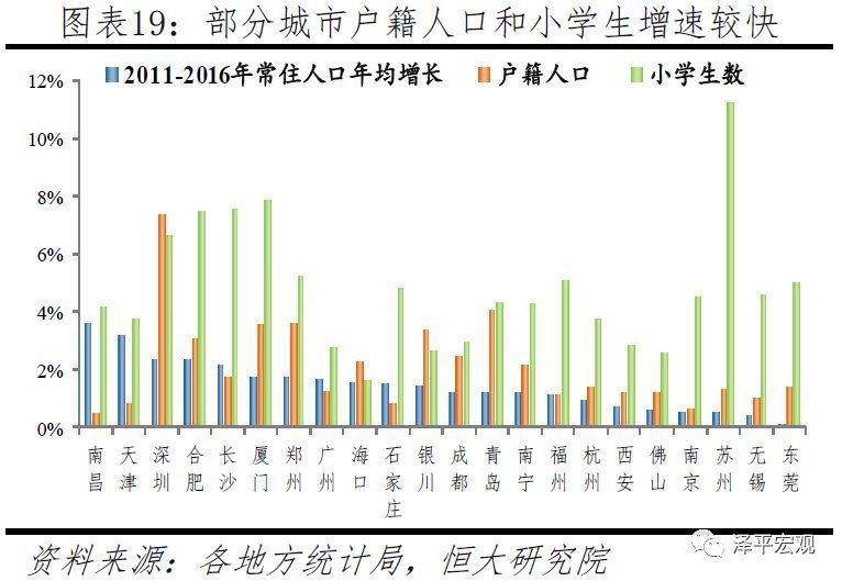 3)对房地产市场,当某地常住人口减少或增长低于自然增长、但户籍人口和小学生明显增长,则该地区的购房需求不一定下降,甚至可能会上升。其中的逻辑在于,户籍人口的置业需求一般高于常住人口中的常住外来人口。不少常住外来人口收入较低、只是来当地挣钱,并没有购房能力及需求,因此常住人口增长只是在个体同质化假设下代表名义购房需求上升。当外来人口在当地落户或将家属子女随迁后,真实购房需求或将上升。反之,若某地常住人口增长超过自然增长,也即常住人口流入时,如户籍人口和小学生都减少,则该地区的购房需求也不一定必然上升。