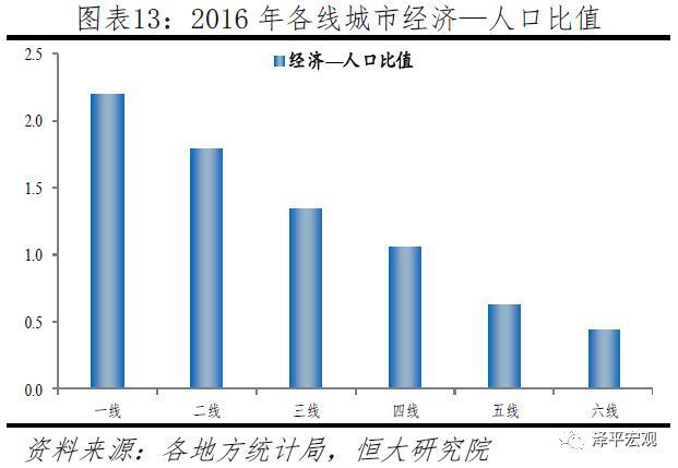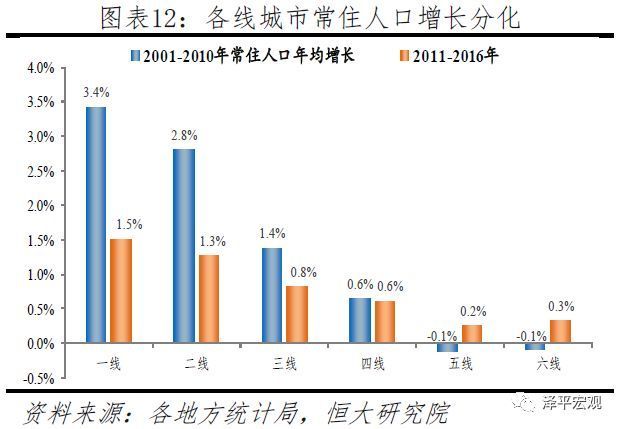 一二线城市常住人口持续大幅流入,三线稍有流入,四线基本平衡,五六线持续净流出。从人口增长看,2001-2010年,一线、二线、三线城市常住人口年均增长率分别为3.4%、2.8%、1.4%,2011-2016年分别放缓至1.5%、1.3%、0.8%,人口持续流入;四线城市保持约0.6%不变、表明人口流入流出基本平衡,以中西部地区为主体的五六线城市受益劳动力回流,常住人口则由负增长转为正增长、但仍低于自然增长率,人口持续净流出。从人口占比看,2001-2010年一、二、三线城市常住人口占比分别上升1.4、2.5、0.7个百分点,四、五、六线城市则分别下降0.1、2.5、1.8个百分点。2011-2016年,一、二、三线城市常住人口占比继续分别上升0.3、0.5、0.1个百分点,四线占比保持不变,五、六线则分别下降0.6、0.4个百分点。基于人随产业走、人往高处走的人口流动逻辑,2016年一二三四五六线城市的经济—人口比值分别为2.20、1.80、1.35、1.06、0.63、0.44。这表明一二三线城市常住人口未来仍将持续流入,而五六线城市人口将继续大幅流出。